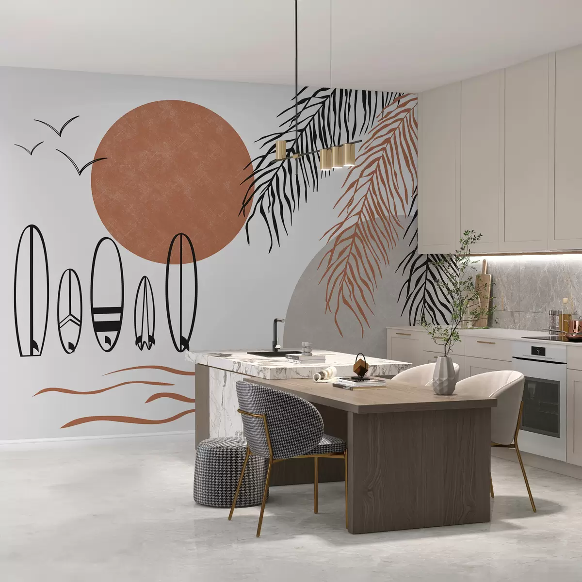 Fotomurales Tablas de surf, dibujo lineal de ramas de palmera, color negro y rojo. Nr. w00958