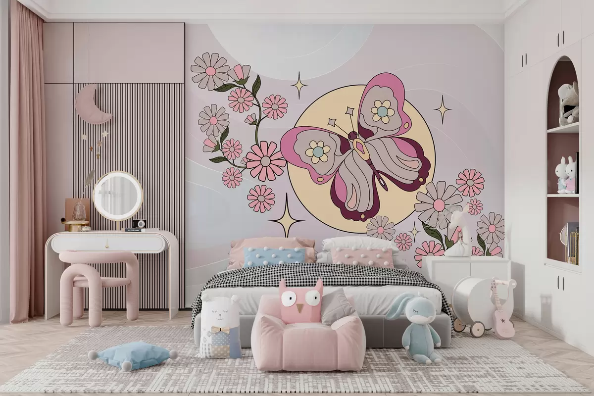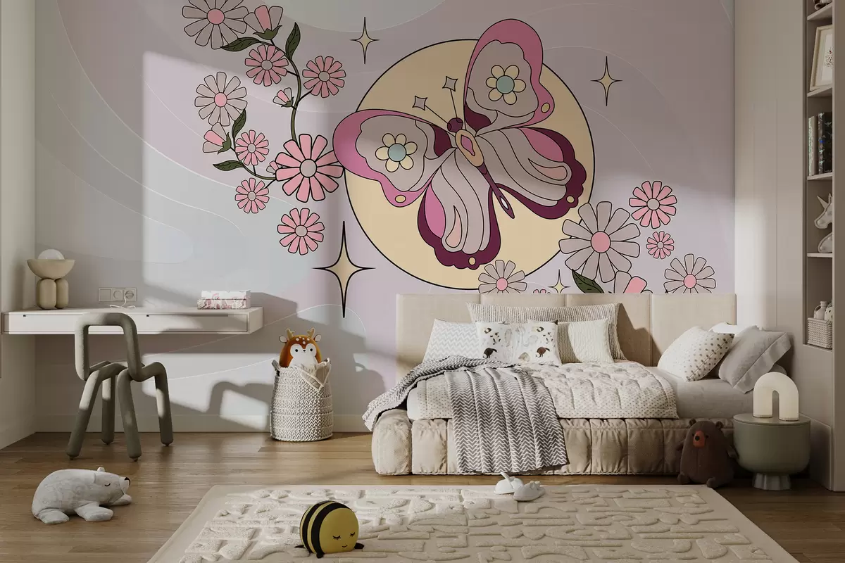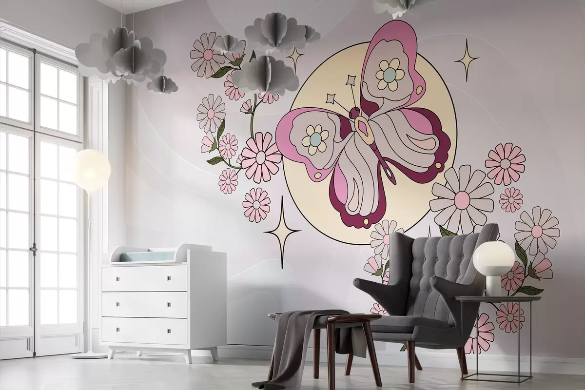 Fotomurales Papel pintado con una mariposa rosa sobre un fondo gris-rosa claro entre flores en un estilo sencillo para la habitación de una niña. Nr. w00985