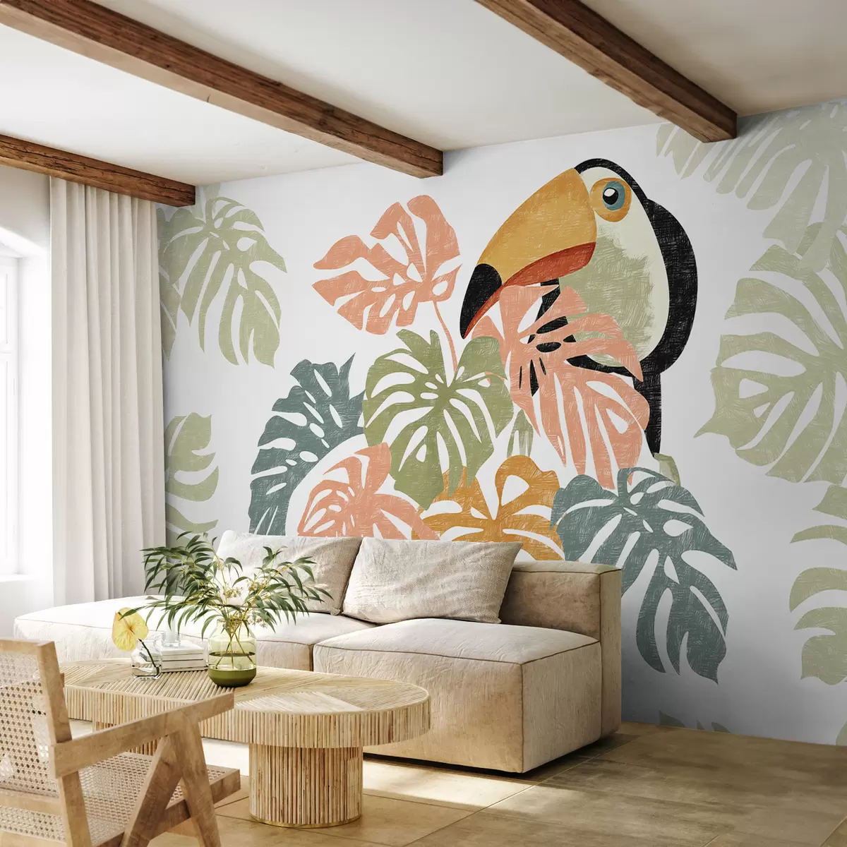 Fotomurales Tucán sentado en el follaje de una monstera tropical, dibujo de imitación de trazo Nr. w01009