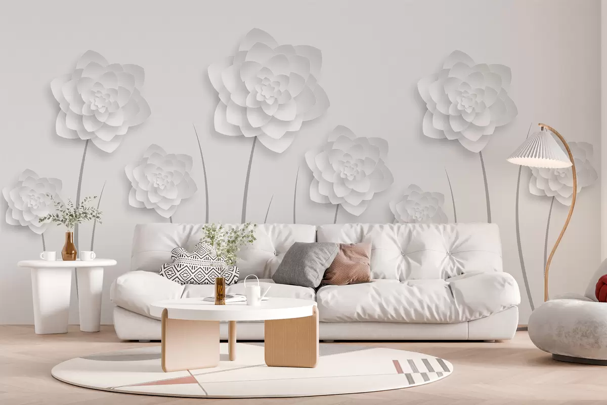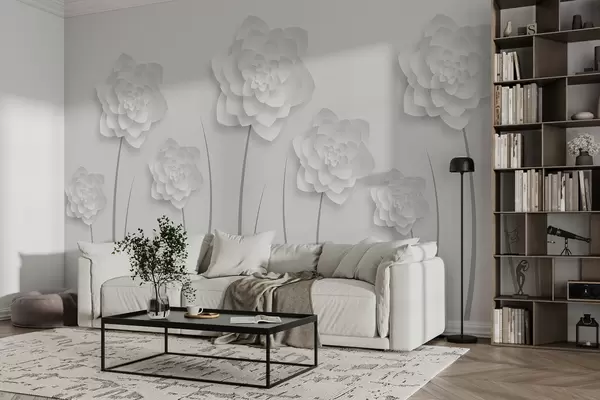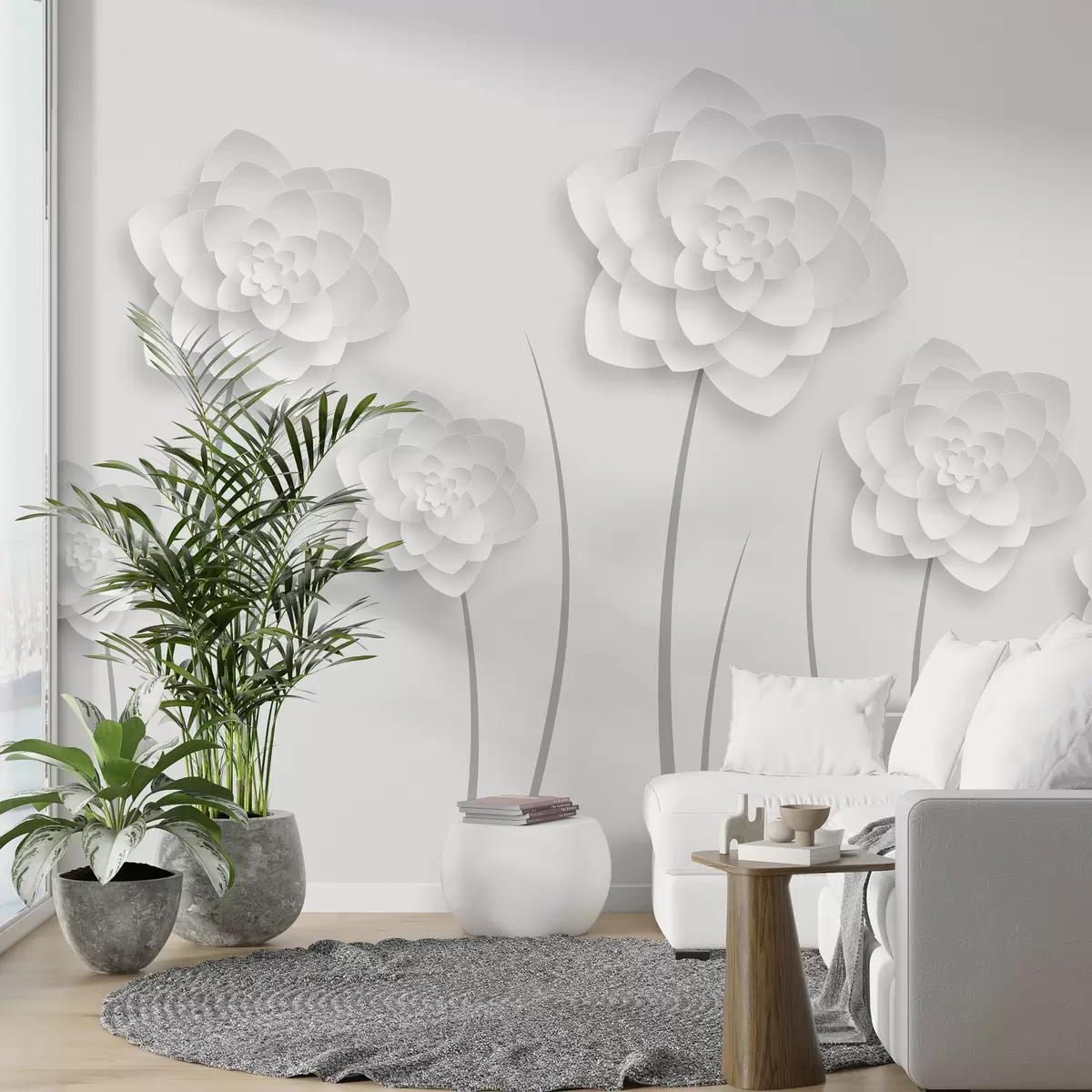 Fotomurales Flores grandes con imitación de volumen en estilo papel sobre fondo gris claro con tallo gris Nr. w01021