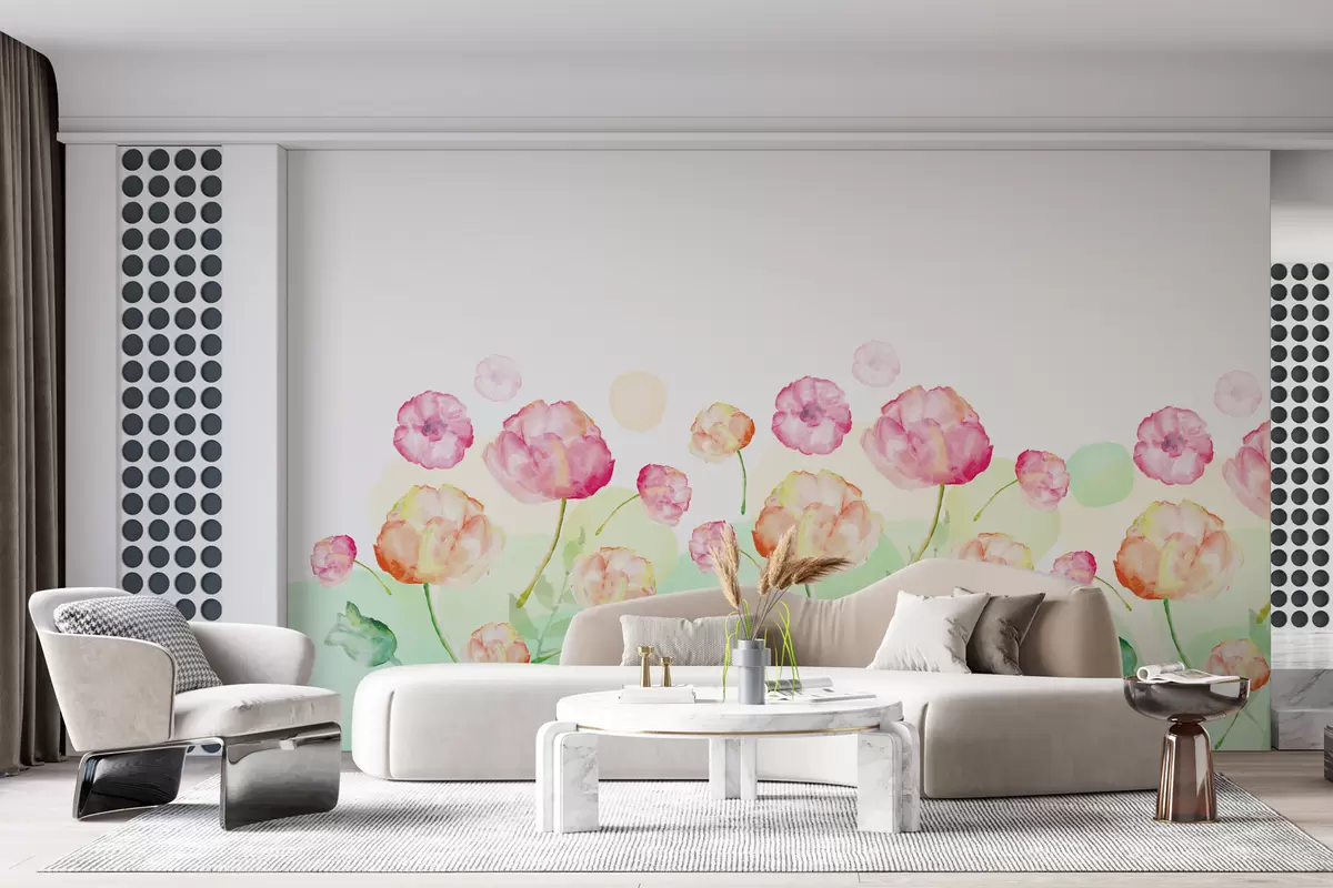 Fotomurales Tulipanes de color rojo anaranjado y rosa en técnica de acuarela sobre fondo blanco con manchas verdes Nr. w01028
