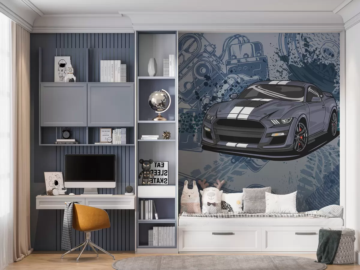 Fotomurales Papel pintado infantil para adolescente con coche y letras gráficas en azul Nr. w01218
