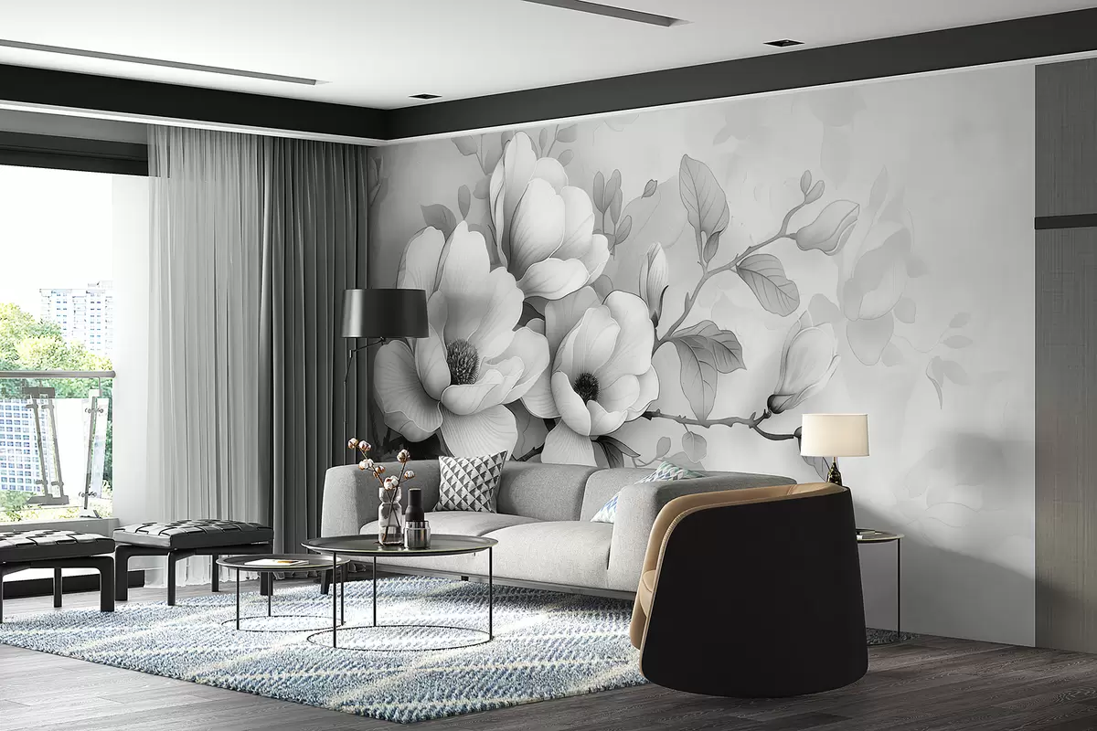 murales de pared Una ilustración en blanco y negro de una magnolia sobre un fondo gris w01277
