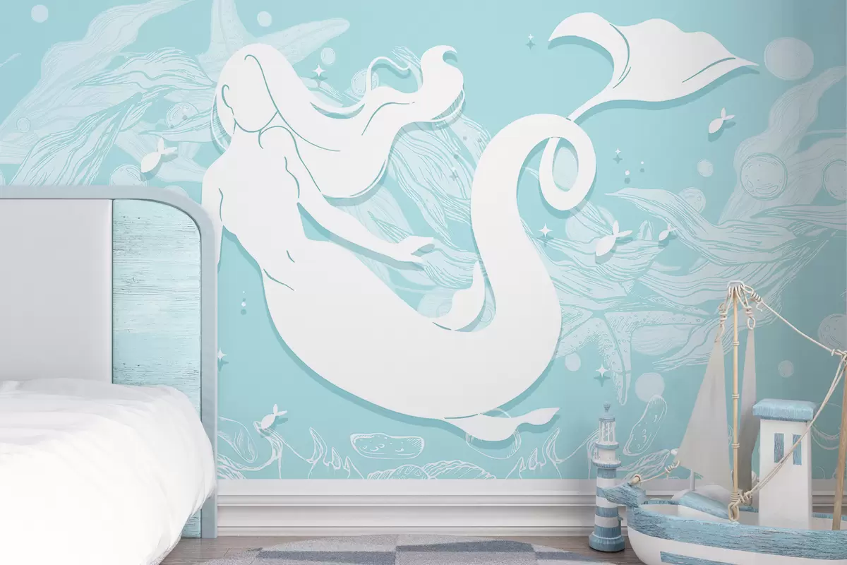 Fotomurales Una sirena blanca con cabello largo y suelto nadando en un océano azul claro con olas blancas y burbujas. Nr. w01316