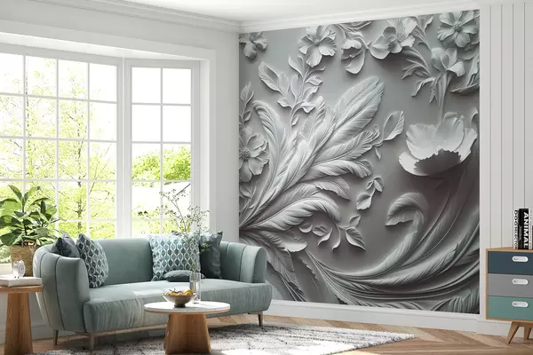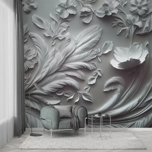 Fotomurales Exquisitas flores y hojas en relieve en tonos grises. Nr. w01356v2