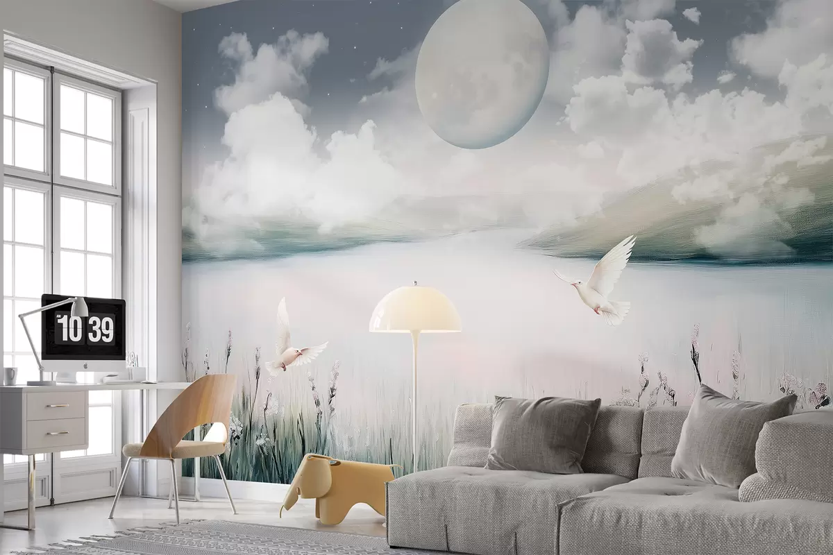 Fotomurales Hermoso paisaje con lago, prado de flores, luna en el cielo estrellado nocturno, pájaros voladores, nubes. Nr. w01389