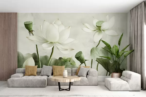 Fotomurales Flores de loto, acuarela, naturaleza, composición floral, hojas grandes, colores verdes suaves. Nr. w01445v2