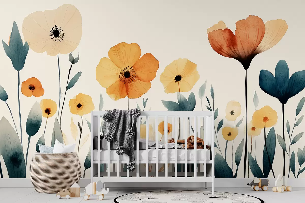 Fotomurales Acuarela de flores de prado, rústica, composición floral, dibujo sencillo, beige, naranja, azul Nr. w01453