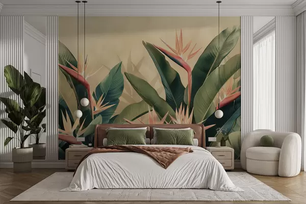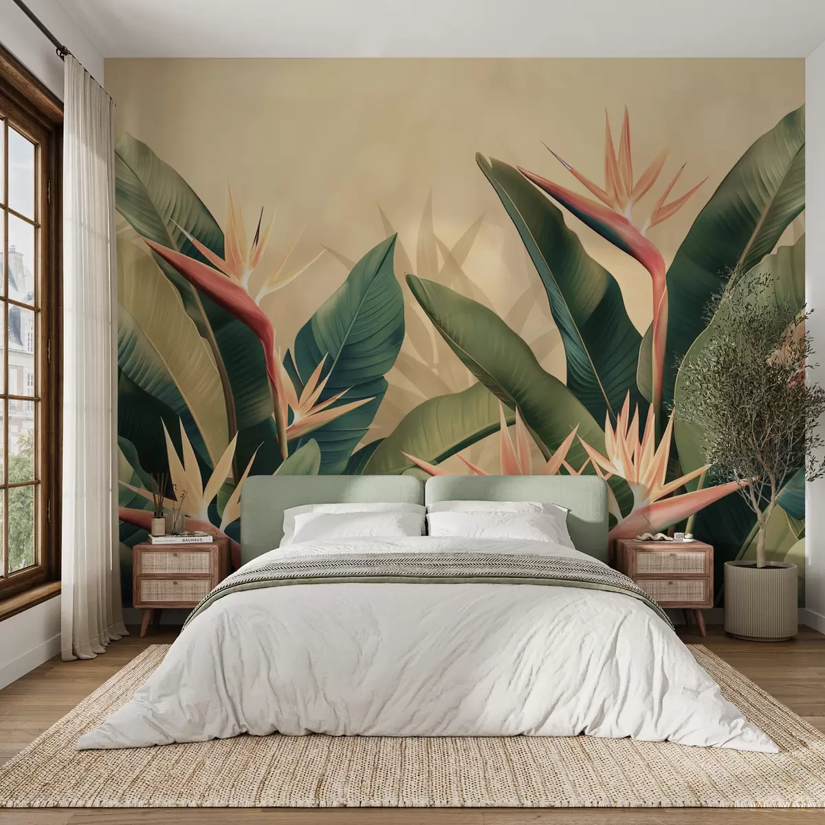 Fotomurales Arreglo exuberante de flores tropicales rodeadas de grandes hojas de color verde oscuro Nr. w01484v1