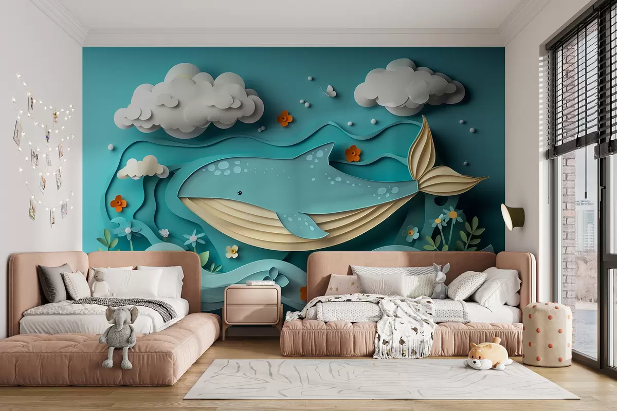 Fotomurales Ballena juguetona en las nubes en estilo de corte de papel, efecto 3D Nr. w01496