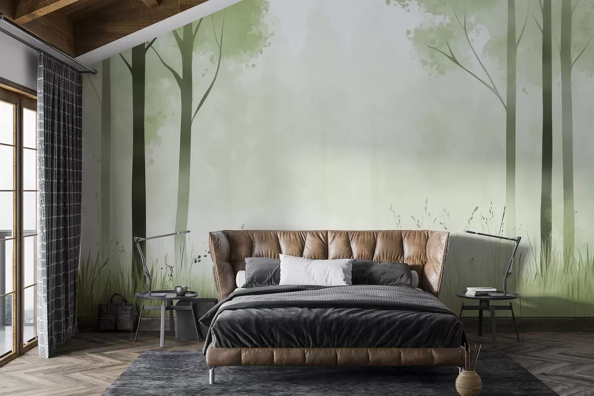 Fotomurales Acuarela bosque, niebla, árboles, hierba, paisaje natural, color verde Nr. w01563v2