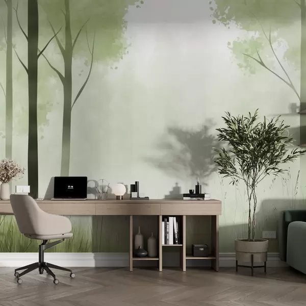 Fotomurales Acuarela bosque, niebla, árboles, hierba, paisaje natural, color verde Nr. w01563v2