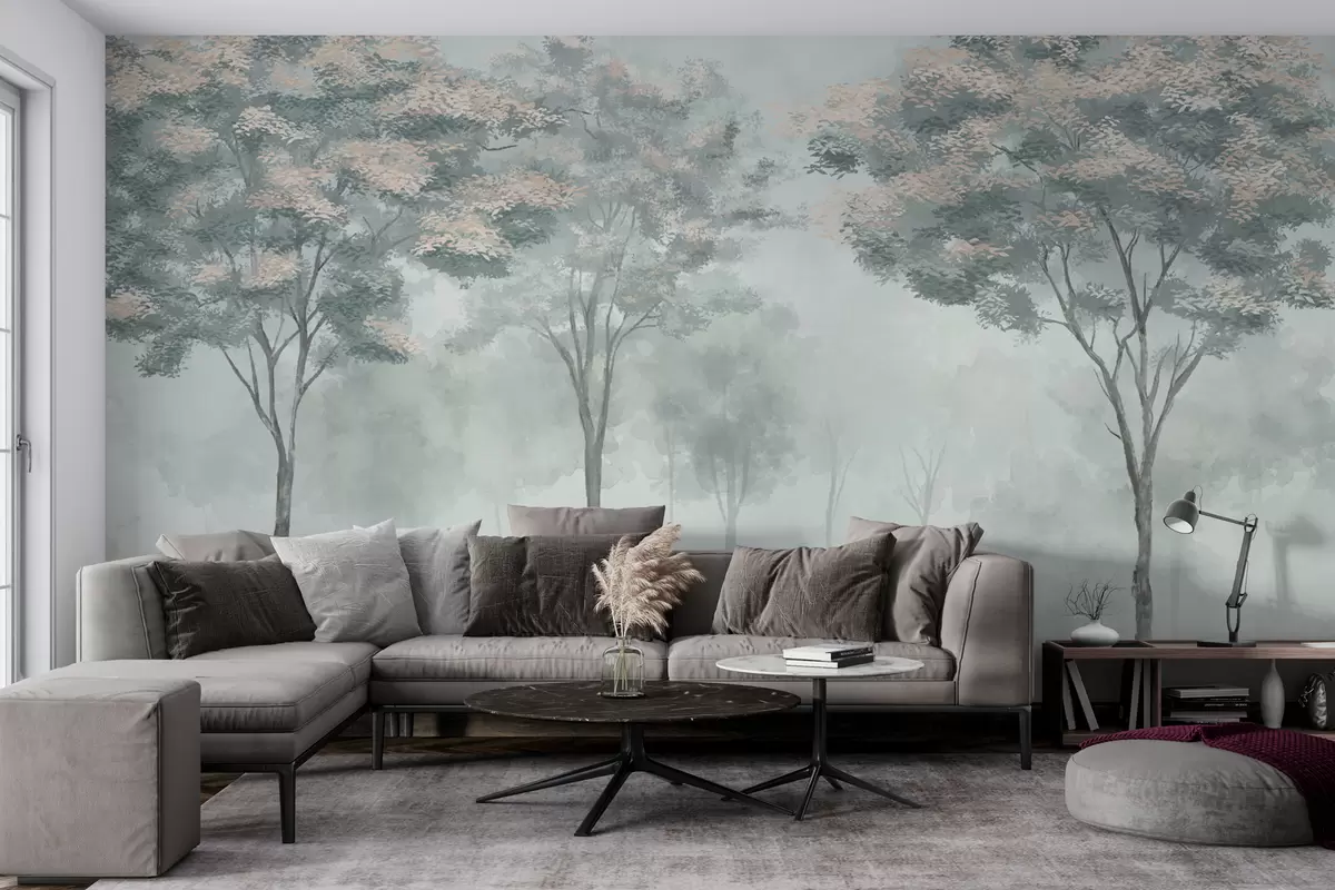 Fotomurales Silueta de bosque brumoso en colores verde, gris claro y beige Nr. w01599