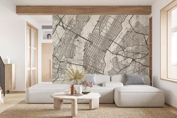 murales de pared Mapa de la ciudad de Nueva York, dibujo lineal, arquitectura, colores beige w01699