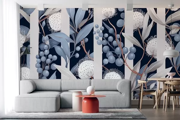 Fotomurales Adorno de flores con bayas silvestres, vintage, colores azul y gris Nr. w01886