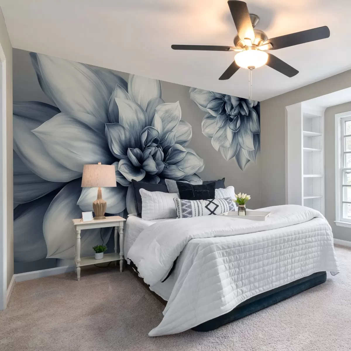 Fotomurales Flores voluminosas con muchos pétalos, representadas en gradaciones de tonos grises y azules Nr. w01937