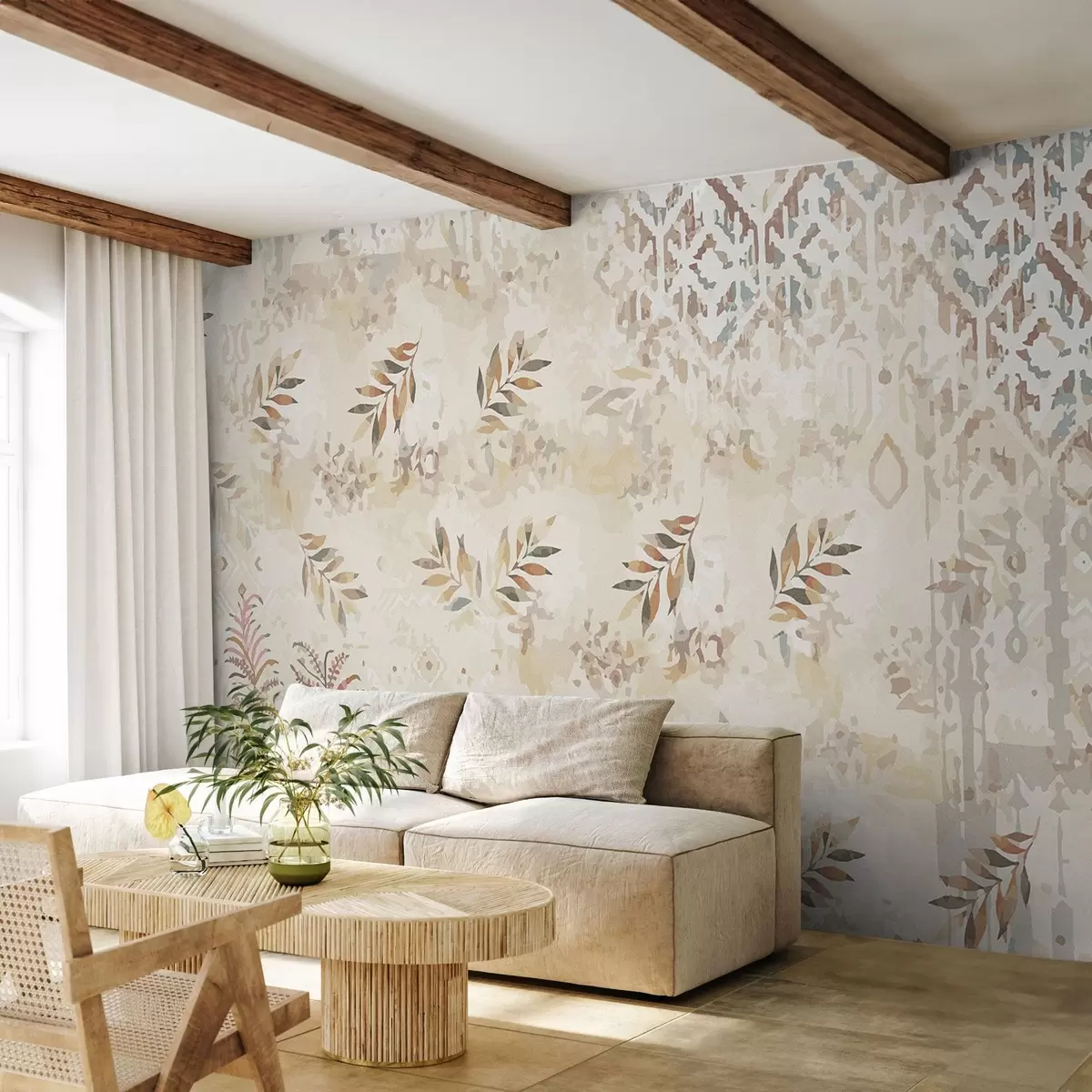 Fotomurales papel pintado de estilo retro con motivos, elementos de abrasión, manchas y hojas, en colores beige Nr. w01955