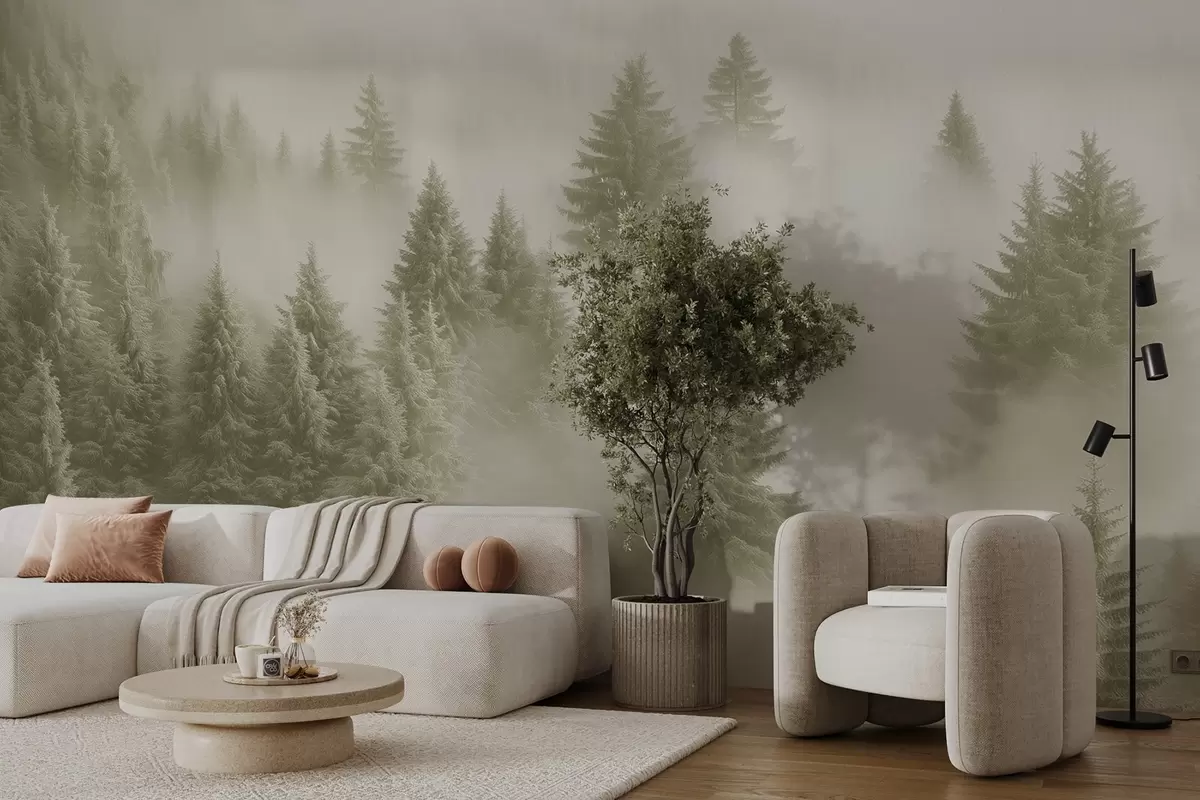 Fotomurales Espesa niebla que envuelve un bosque nevado por la mañana en suaves tonos verdes Nr. w02064v2