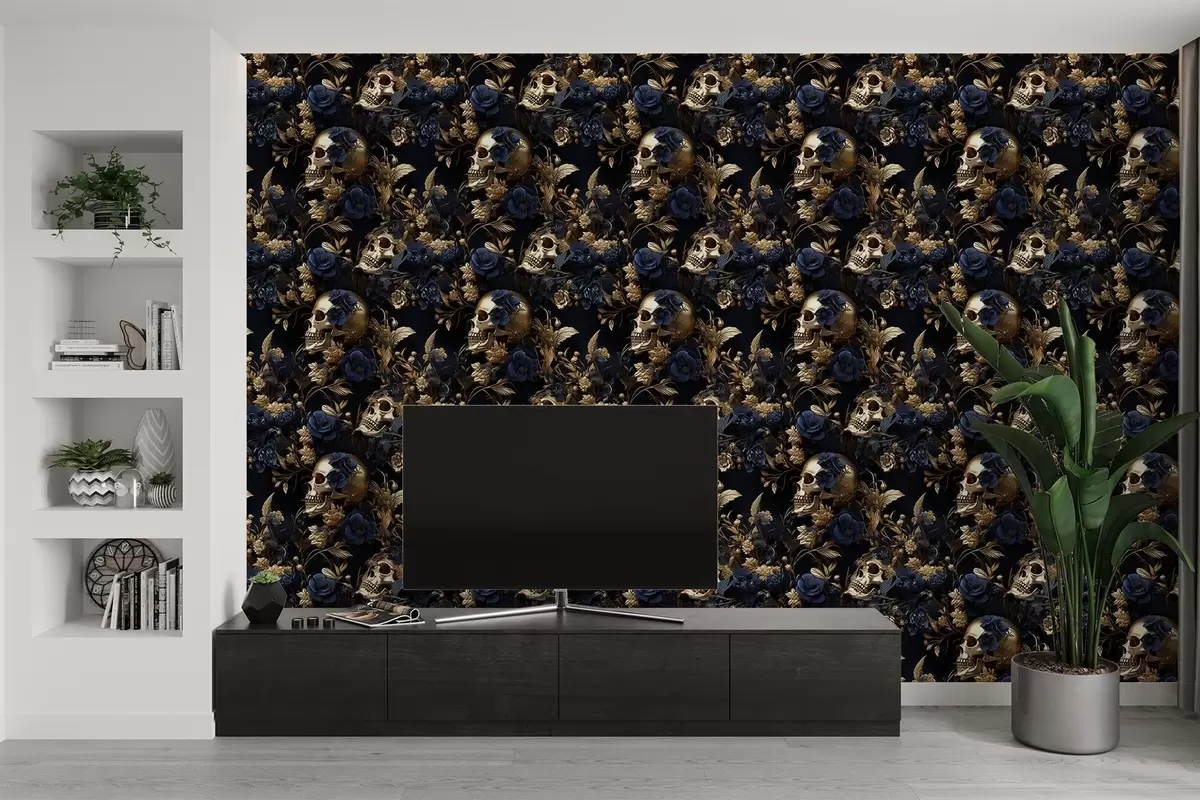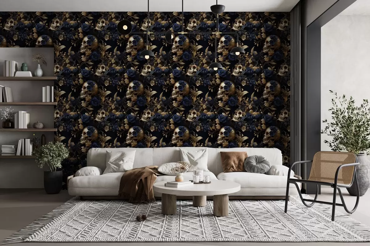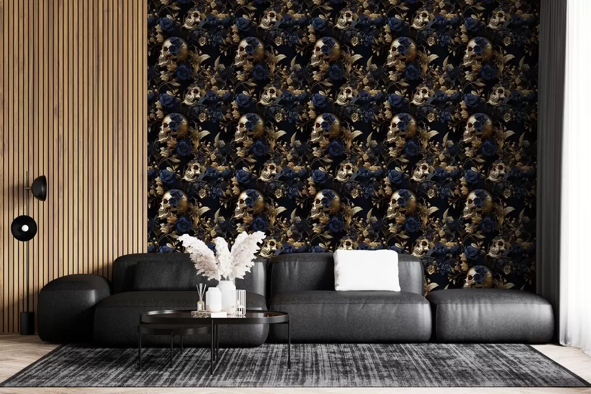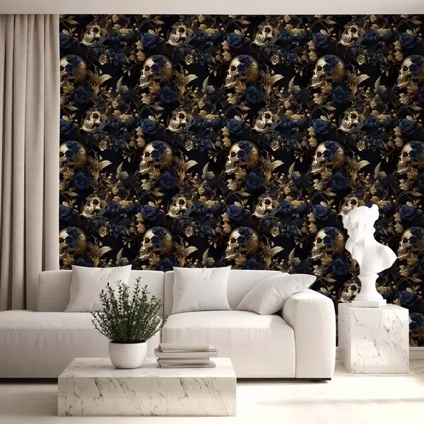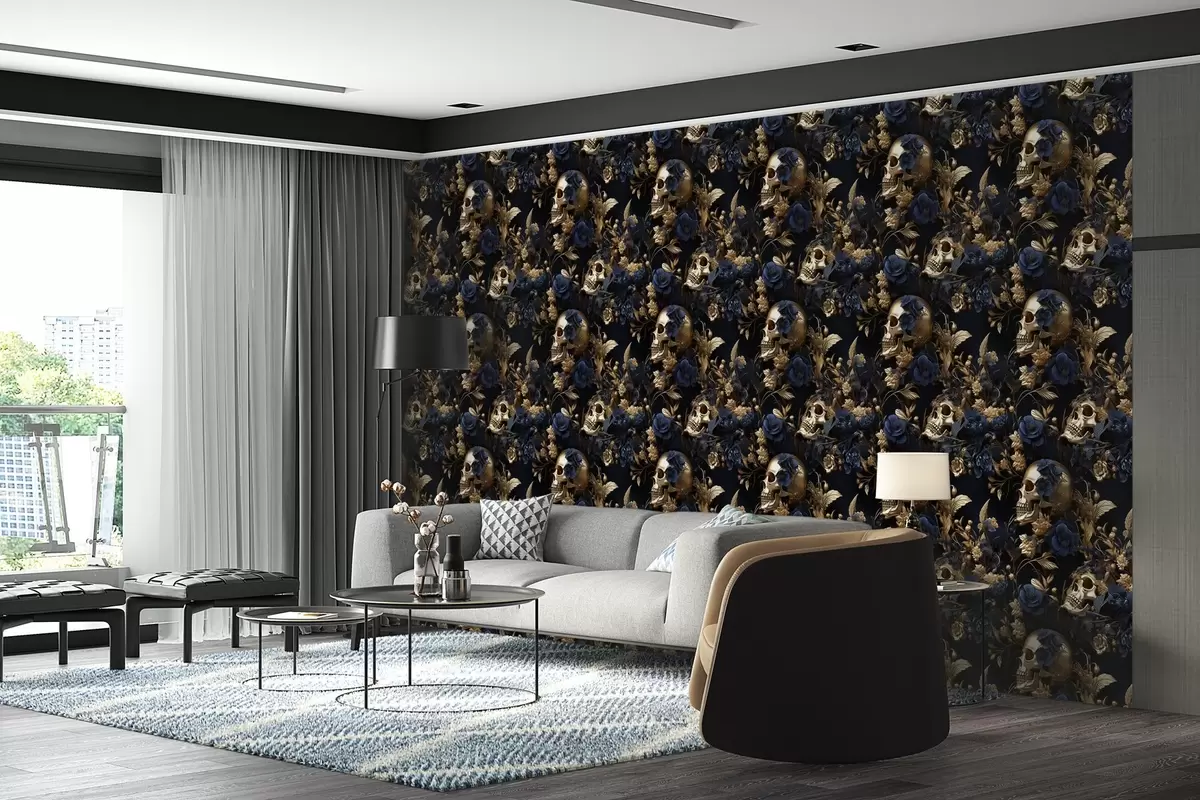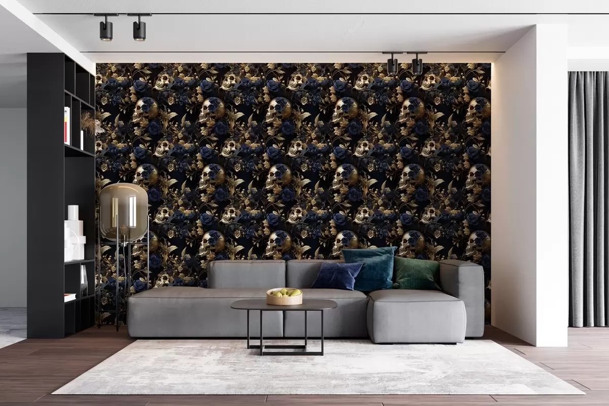 Fotomurales Papel pintado de estilo lujoso con motivos de calaveras metálicas amarillas y flores oscuras Nr. w02085