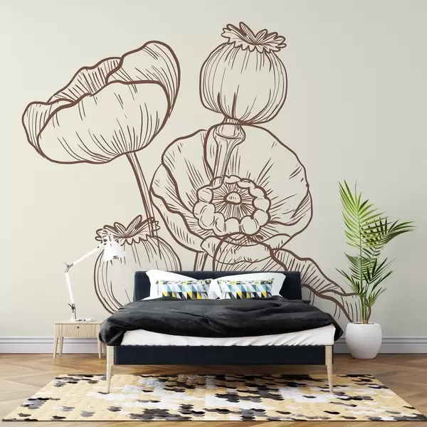 murales de pared Flor de amapola marrón, con líneas,Amapola w02100v2
