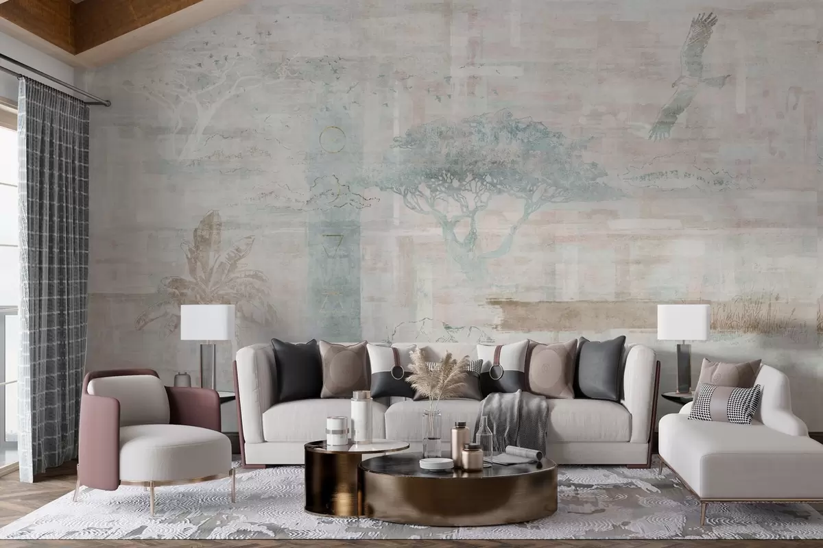 Fotomurales Diseño de efecto grunge vintage con árboles, águila y elementos geométricos Nr. w02130