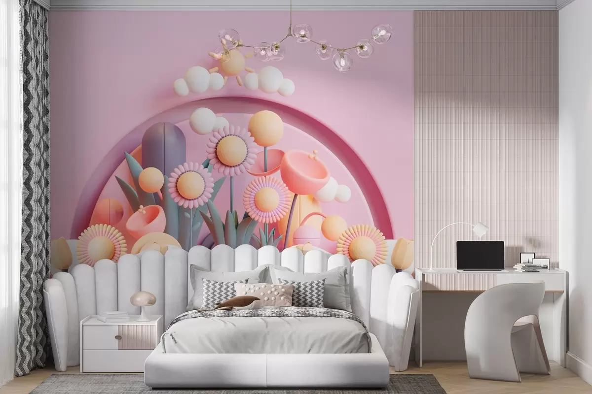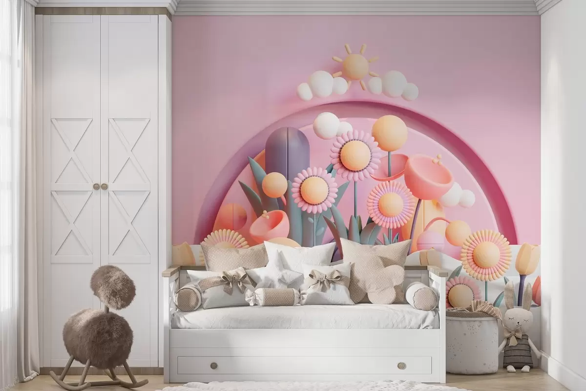Fotomurales Papel pintado infantil en estilo 3D con flores y nubes en tonos rosas Nr. w02136