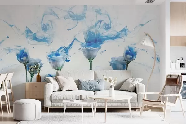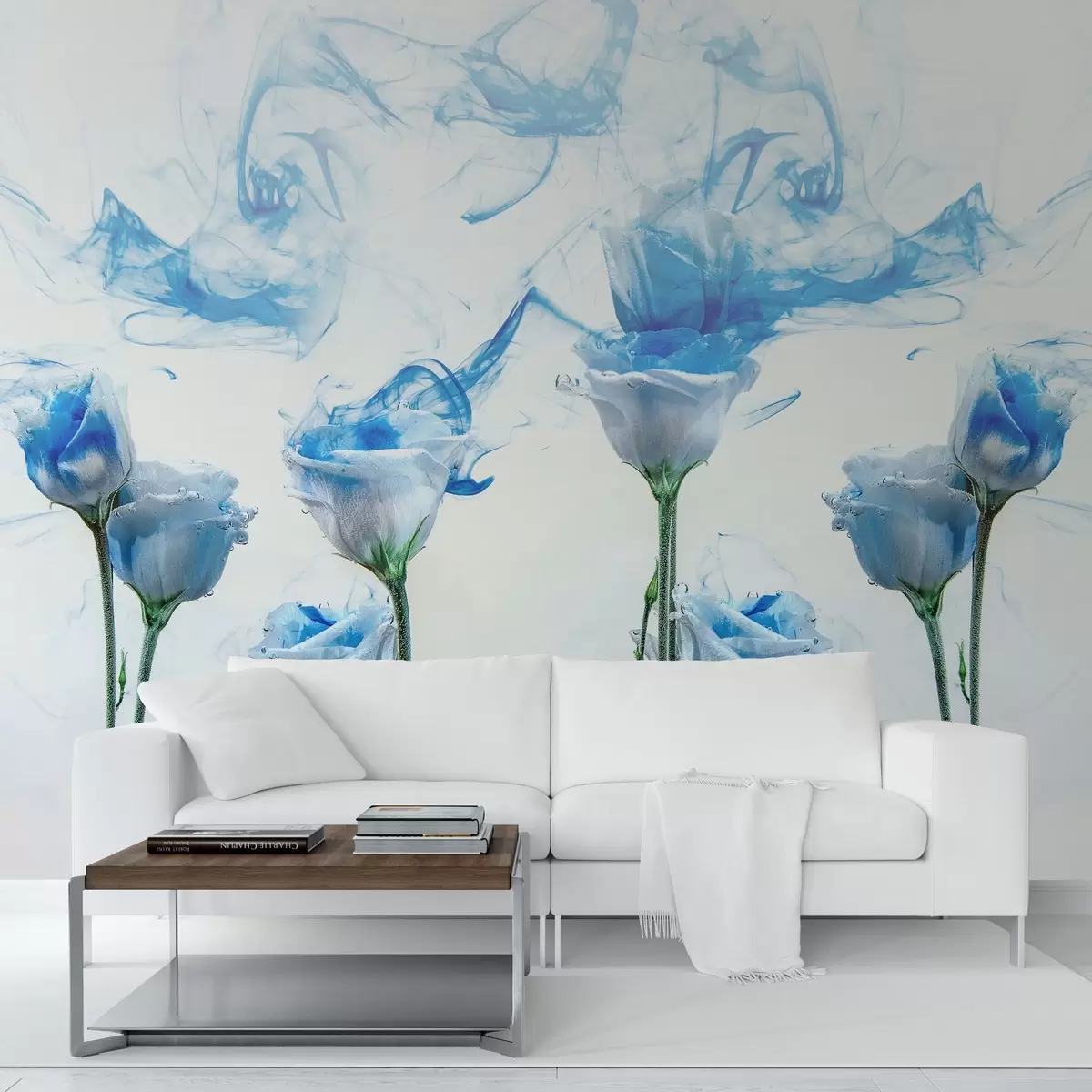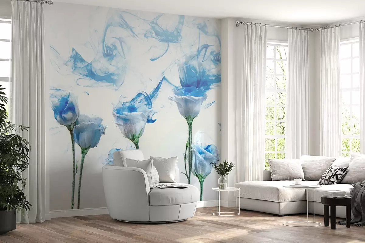 Fotomurales Rosas blancas bajo el agua sobre fondo blanco con vetas de pintura acrílica azul. Nr. w02139