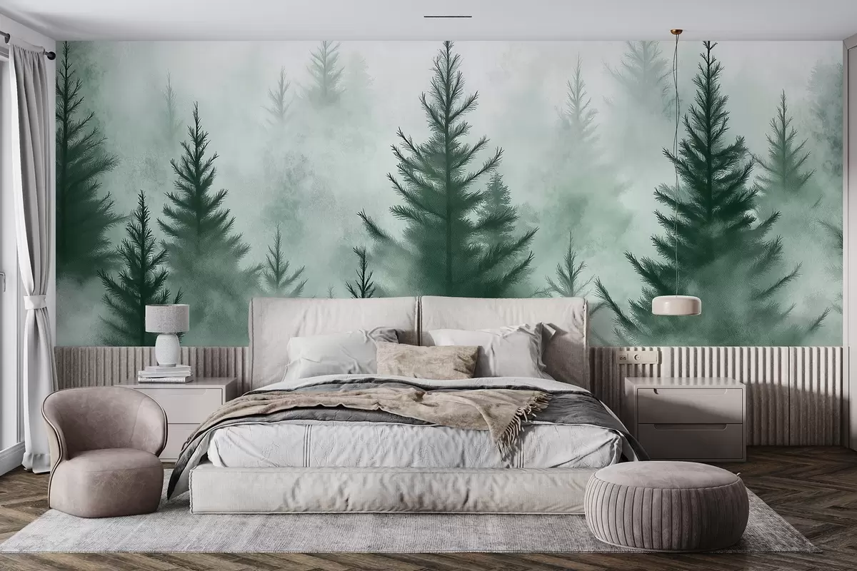 Fotomurales Bosque en la niebla, pinos, acuarela, colores verdes Nr. w02152v1
