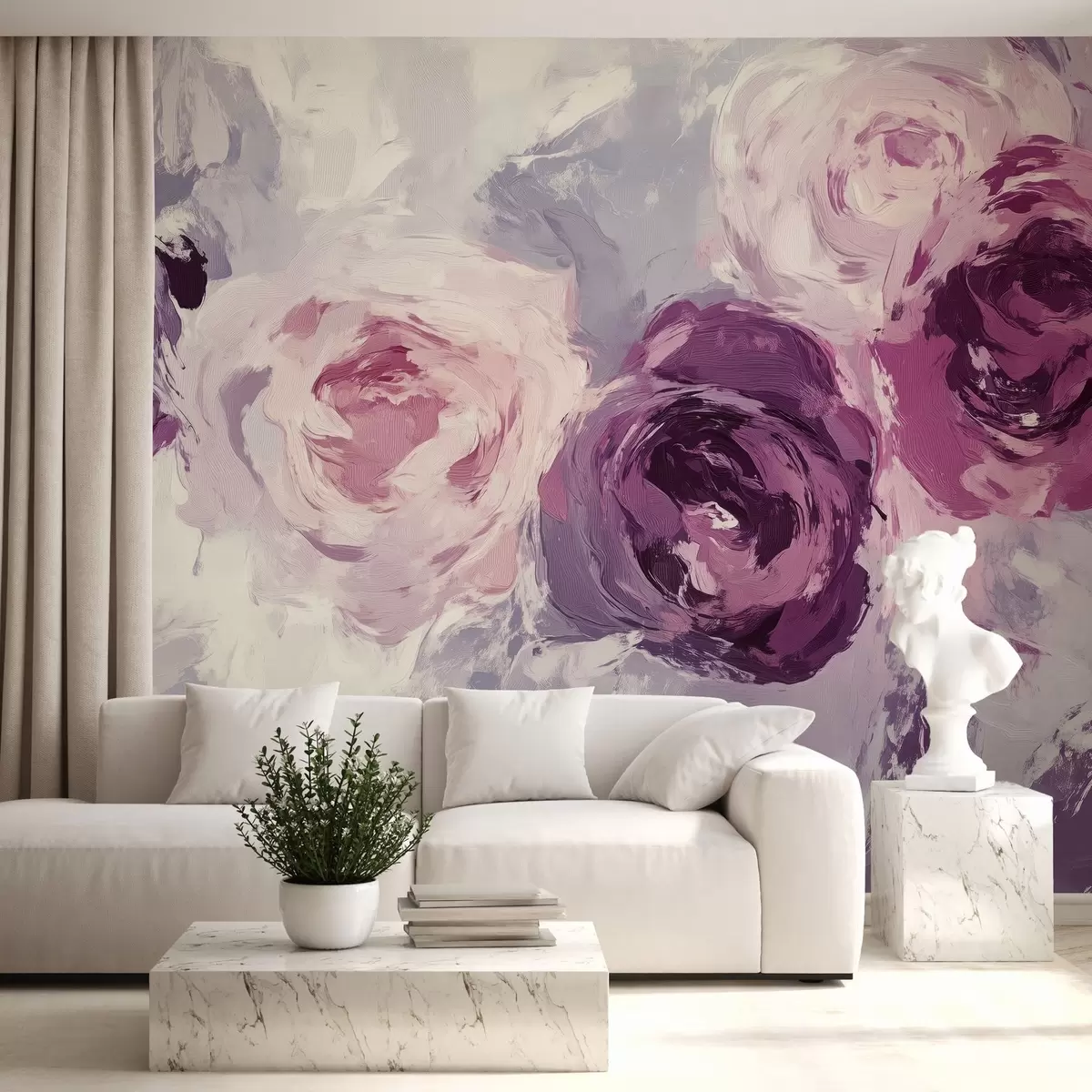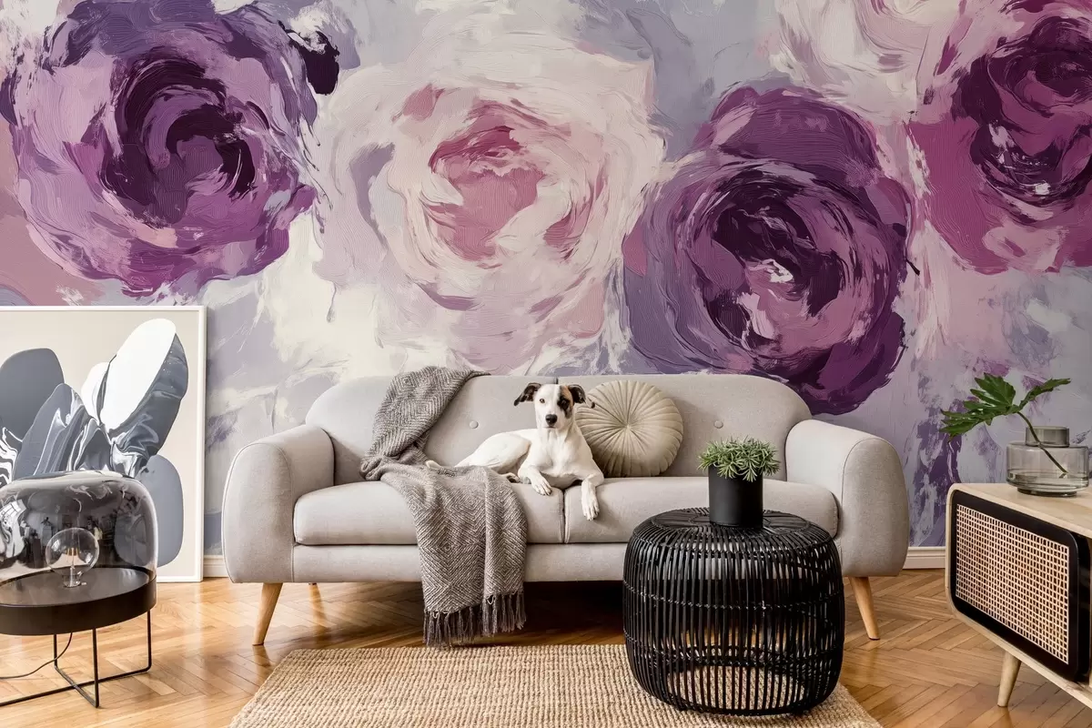 Fotomurales El papel pintado es una imitación de la pintura al óleo, con grandes flores de rosa difuminadas en tonos pastel. Nr. w02288