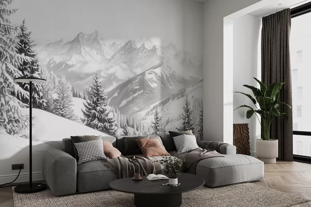 Fotomurales Invierno en las montañas, bosque, Alpes, dibujo a lápiz, paisajes de naturaleza Nr. w02353