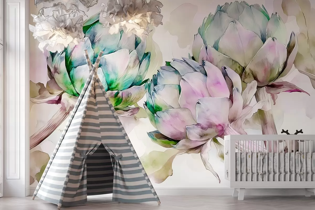 Fotomurales Alcachofas estilo acuarela, flores, morado y verde Nr. w02481