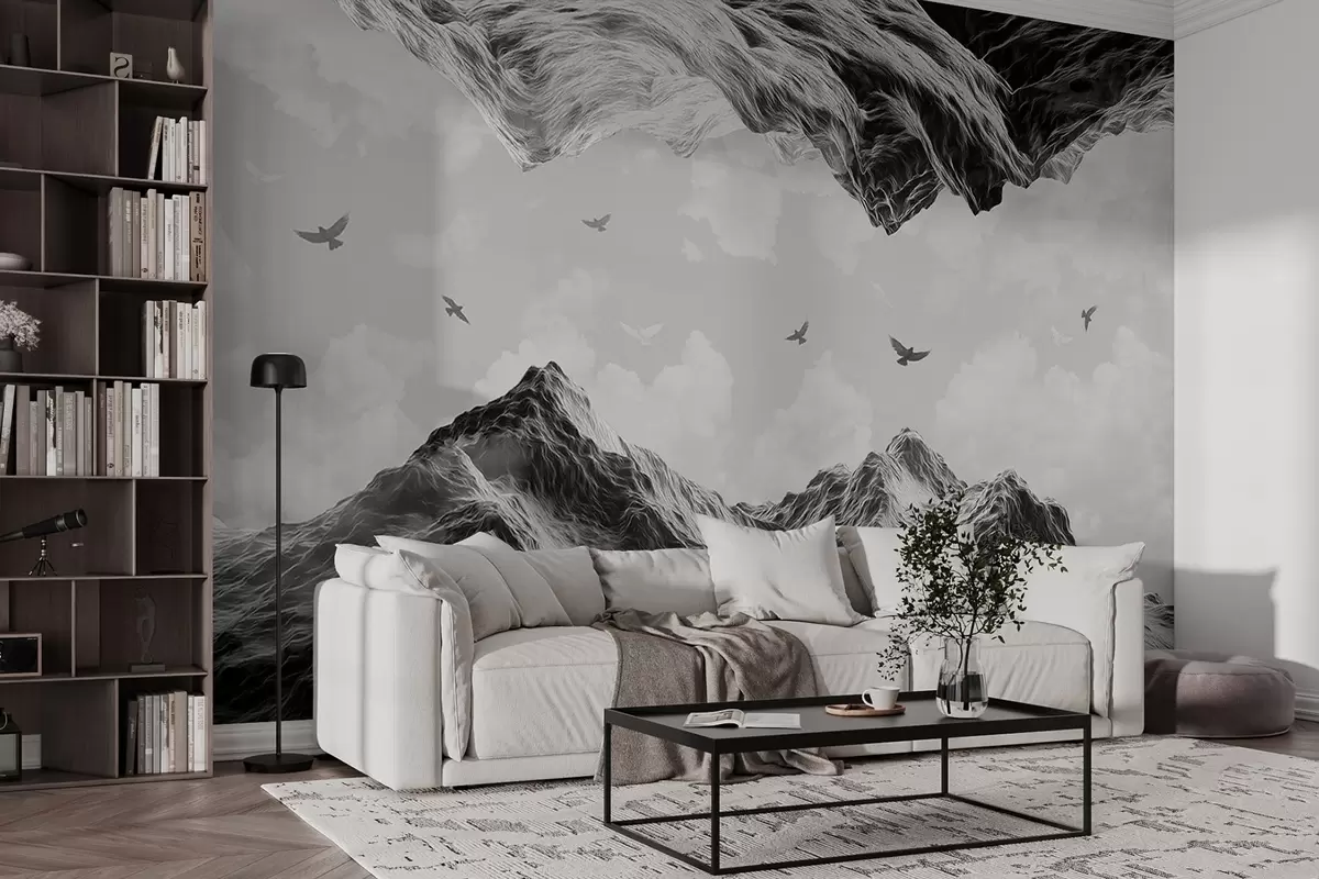 Fotomurales Paisaje de montaña, realismo, pájaros volando, naturaleza, nubes, colores blanco y negro Nr. w02514