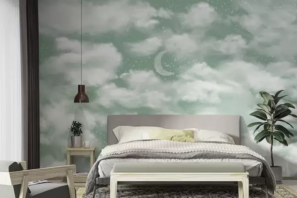Fotomurales Cielo estrellado con luna y nubes, soñador, etéreo, colores verdes suaves Nr. w02515v2