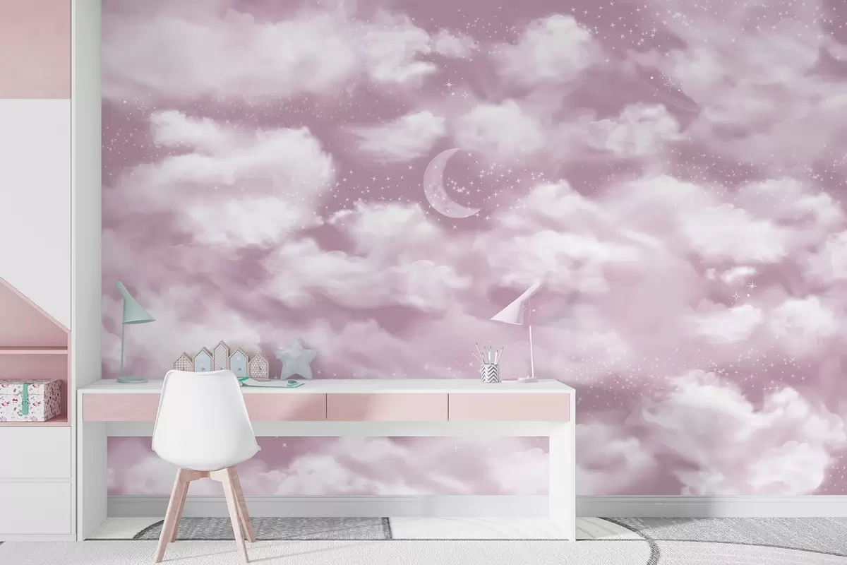 Fotomurales Cielo estrellado con luna y nubes, de ensueño, etéreo, colores rosa suave Nr. w02515v3