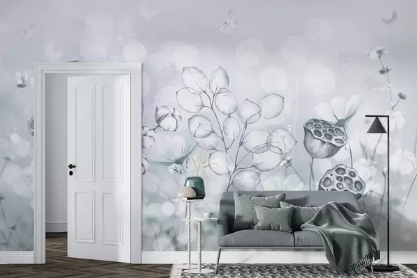 Fotomurales Jardín de flores de ensueño, mariposa, flores de algodón, lotos, colores grises Nr. w02516v2