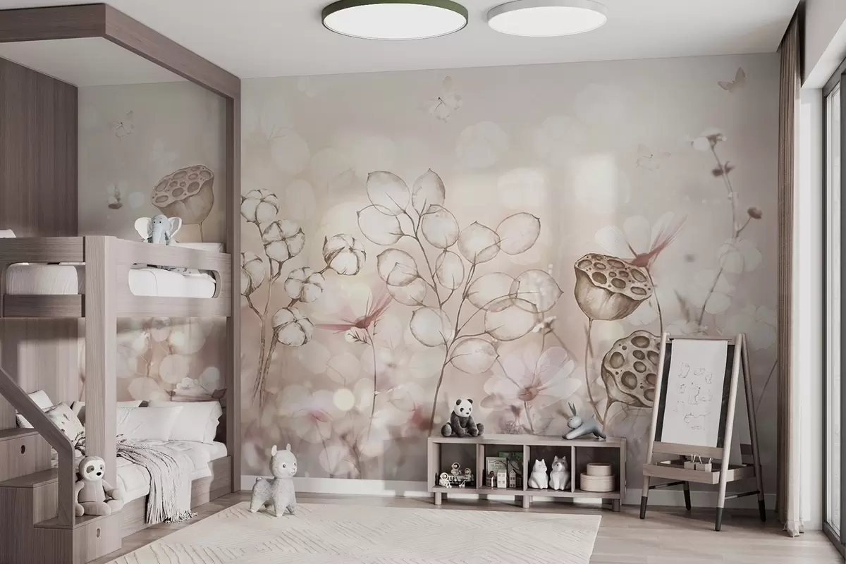 Fotomurales Jardín de flores de ensueño, mariposa, flores de algodón, lotos, colores beige Nr. w02516v3