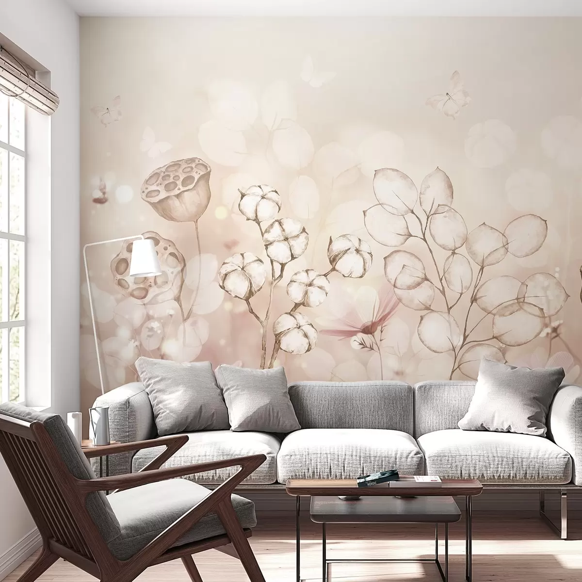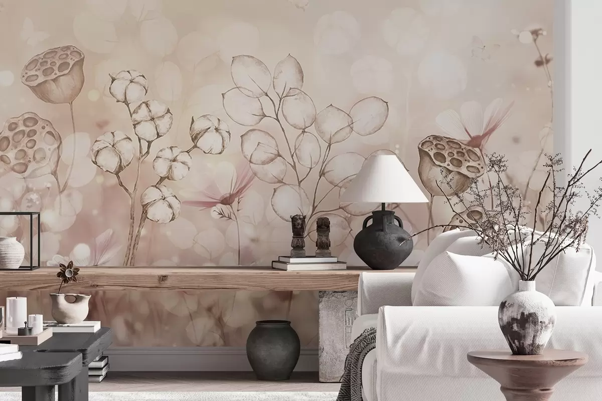 Fotomurales Jardín de flores de ensueño, mariposa, flores de algodón, lotos, colores beige Nr. w02516v3