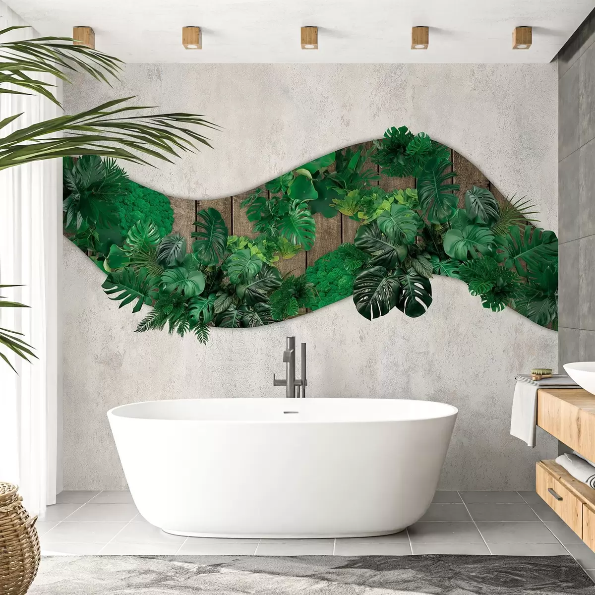 Fotomurales Adorno de pared con plantas, musgo, hojas de palmera, fondo de madera, vegetación Nr. w02658v1
