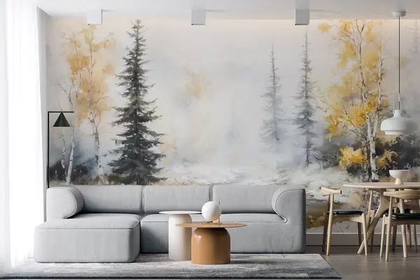 Fotomurales Bosque invernal, abedules, pinos, río, niebla, colores pastel Nr. w02742