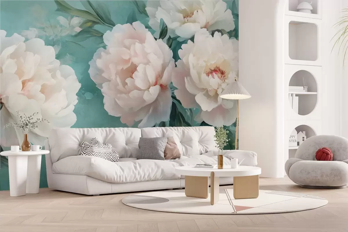 Fotomurales grandes flores de exuberantes peonías sobre fondo turquesa Nr. w02763