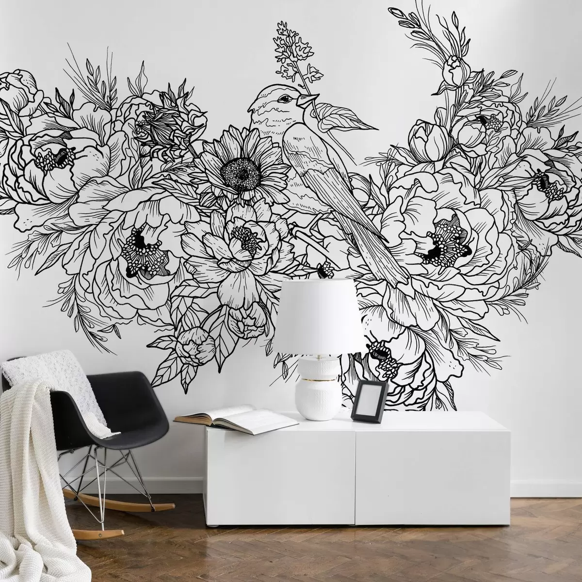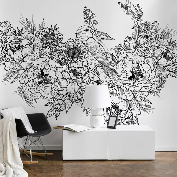 Fotomurales Arte lineal detallado de un pájaro y un arreglo floral Nr. w02833v1