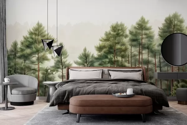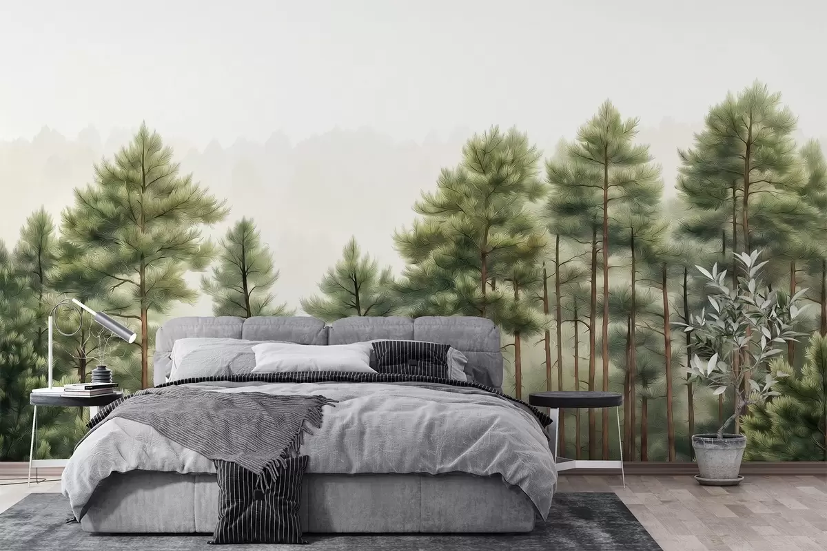 Fotomurales Bosque con pinos, dibujo al óleo, naturaleza Nr. w02942