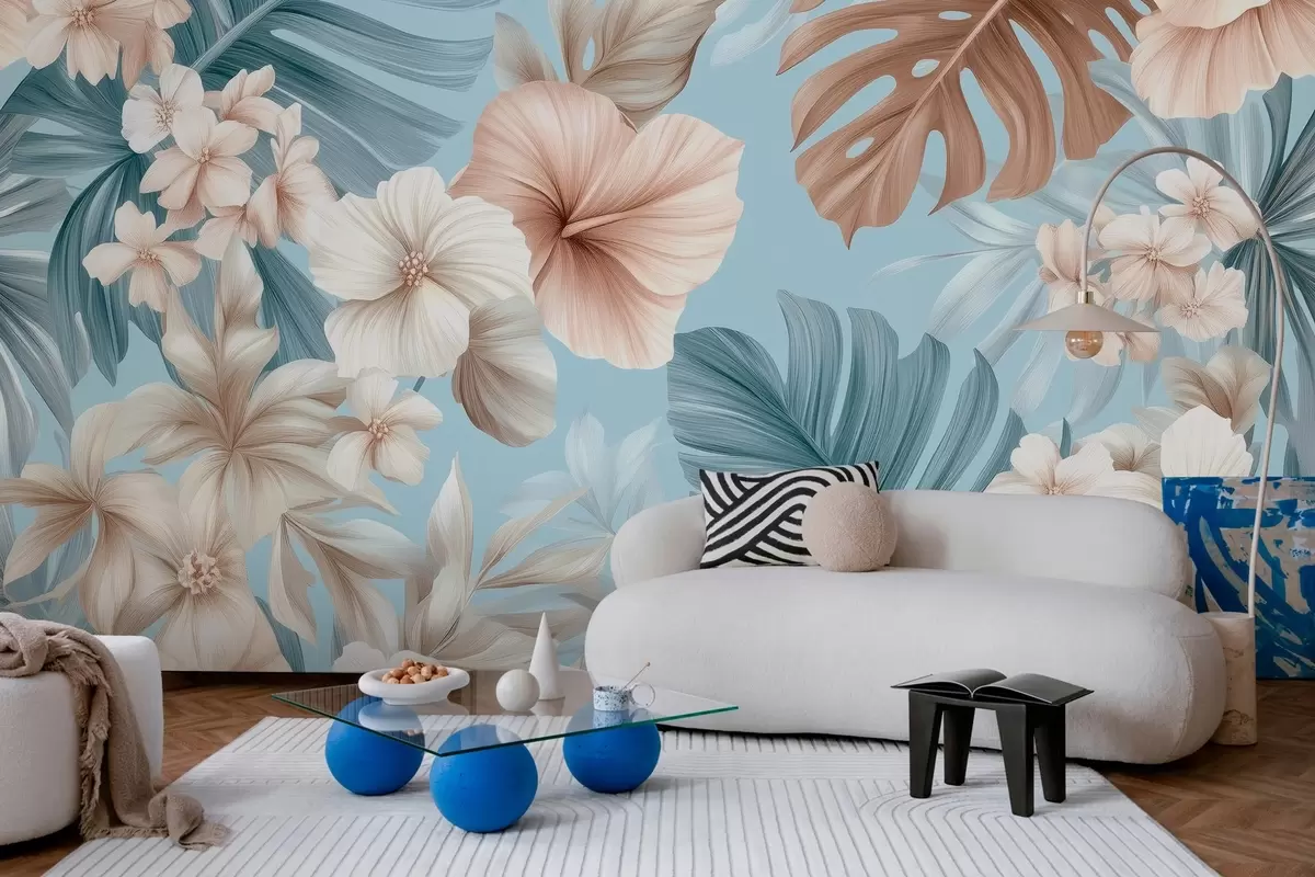 Fotomurales estampado tropical con grandes hojas y flores en tonos azul pastel y beige Nr. w03013