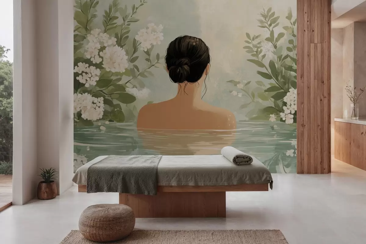 Fotomurales una serena y soñadora ilustración botánica de una mujer bañándose en una tranquila y reflexiva masa de agua, rodeada de exuberante vegetación y delicadas flores blancas. Nr. w03014