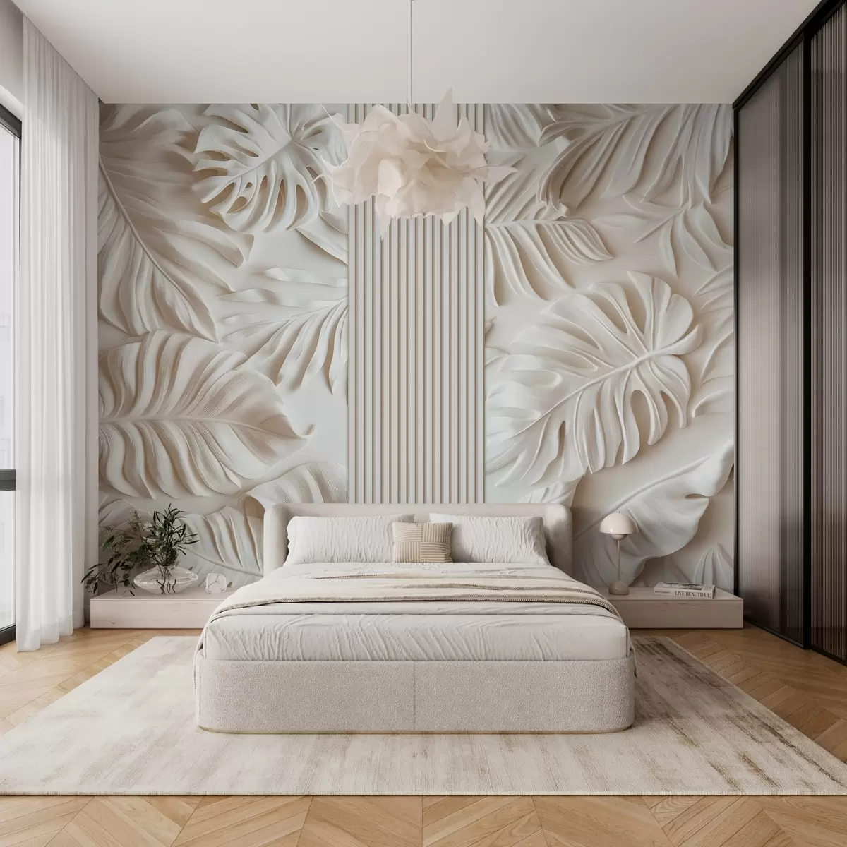 Fotomurales grandes hojas tropicales imitación de bajorrelieve y paneles en colores claros Nr. w03119