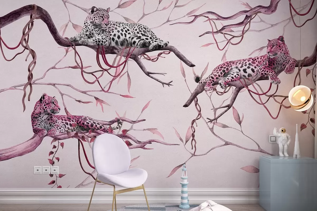 Fotomurales Leopardos en los árboles de la selva, lianas, tropical, animales salvajes, paleta de color rosa Nr. w03146v2