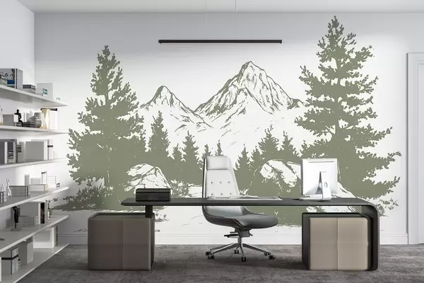 Fotomurales Los Alpes, montañas con bosque, dibujo lineal, color verde Nr. w03342v1