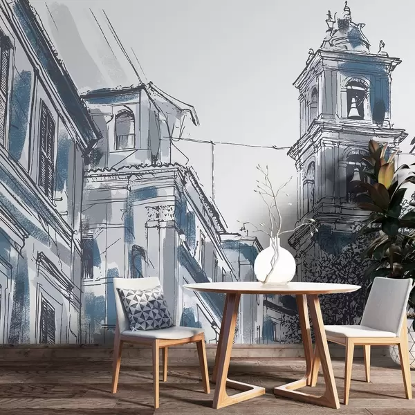 Fotomurales Calle de ciudad mediterránea, capilla, arquitectura, colores gris y azul Nr. w03350