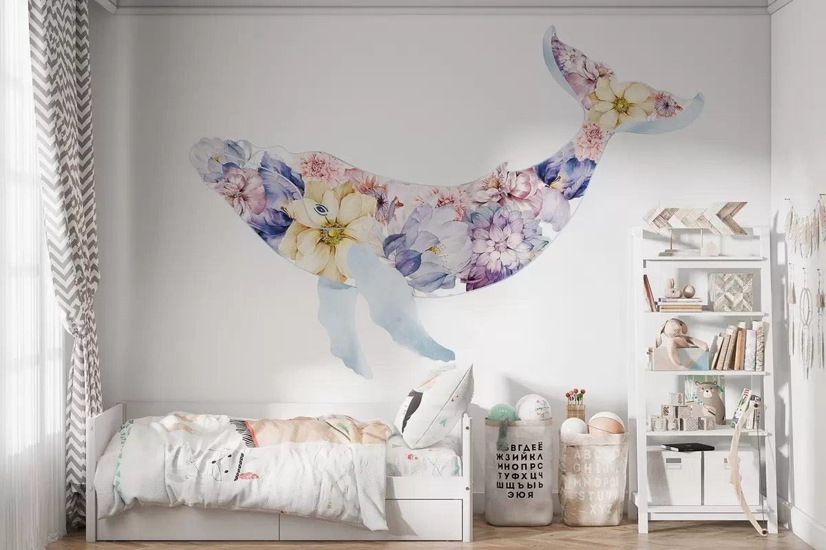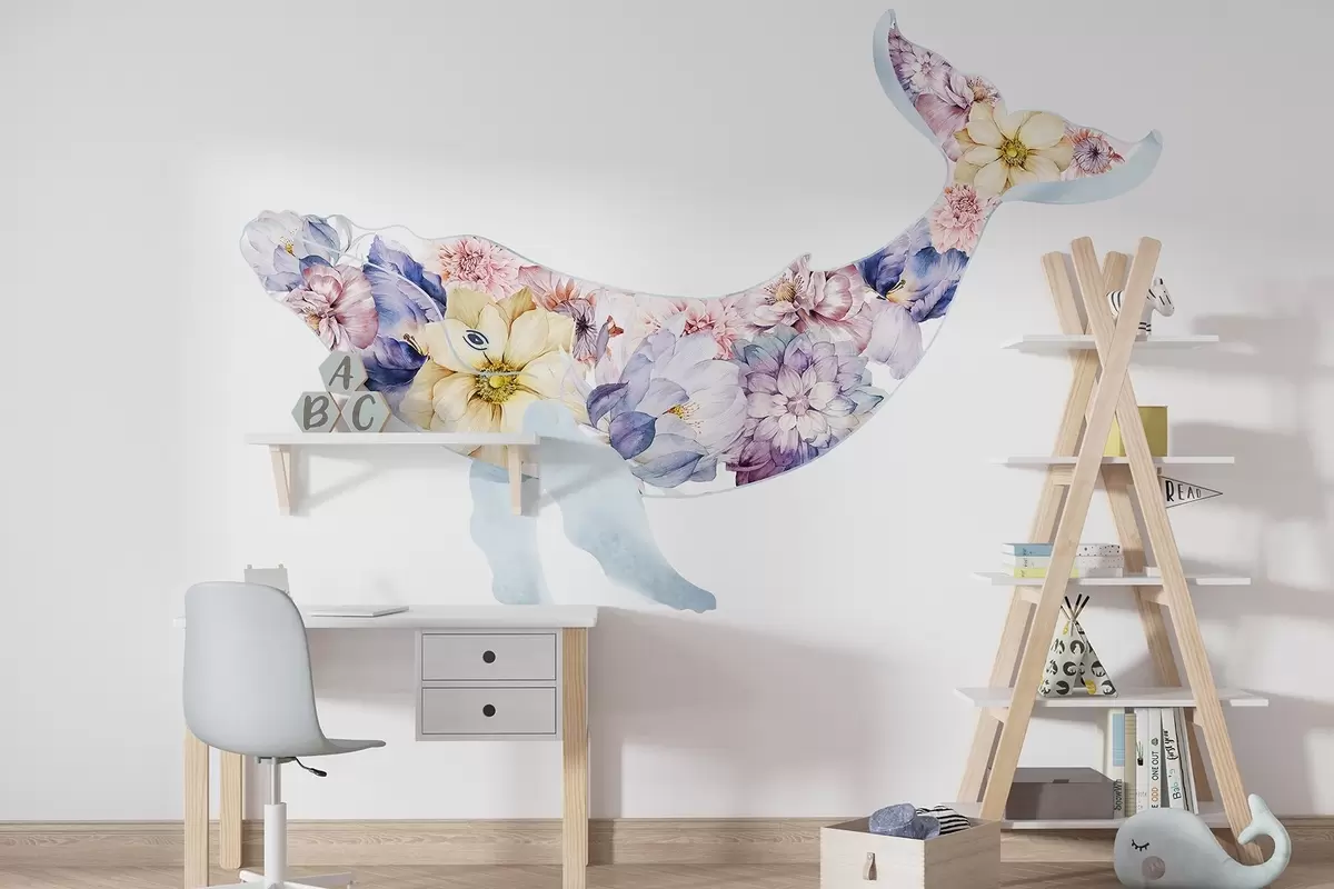 Fotomurales Hermosa ballena con flores de acuarela, animales marinos, colorido Nr. w03445