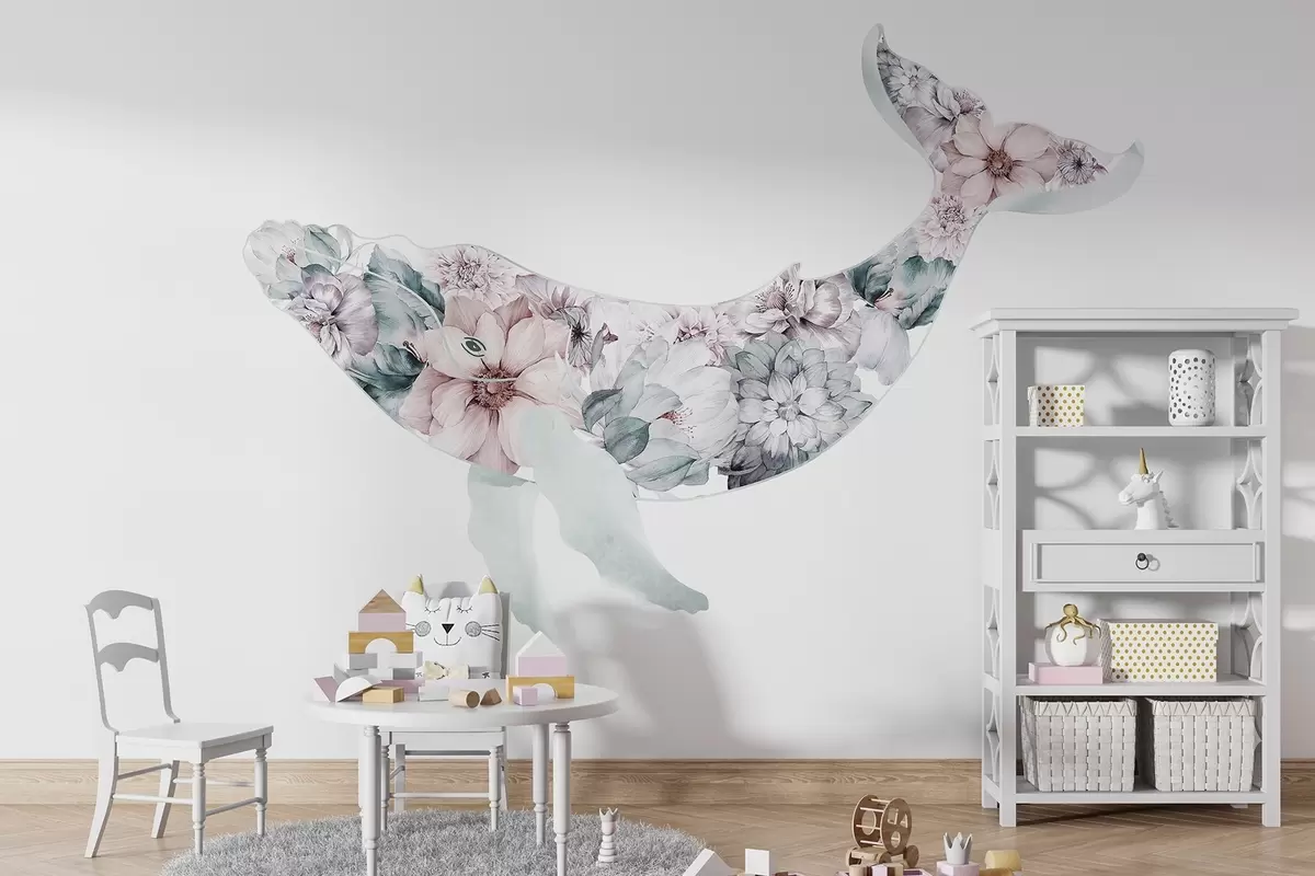 Fotomurales Hermosa ballena con flores de acuarela, animales marinos Nr. w03445v1